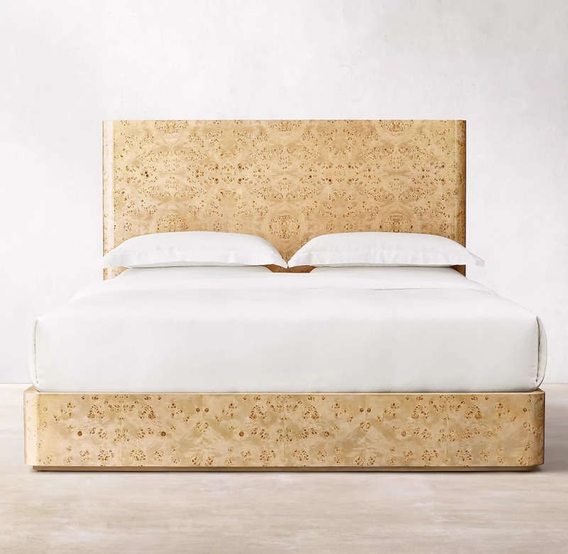 Annahme seltener Burl -Holzfurniers (wie Maple Burl, Walnut Burl). Die Textur jedes Stücks Furnier ist ein einzigartiger Fingerabdruck, der durch natürliches Wachstum gebildet wird. Der goldene Ton ist mit Flecken und Kurven verschiedener Tiefen verwoben, wie ein natürliches künstlerisches Totem, das den Bettkörper mit nicht reproduzierbarem hohem Niveau -Sinn aussieht.