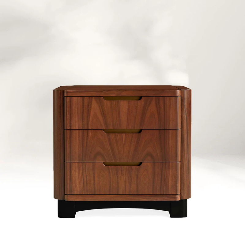 Dieser Nachttisch zeigt ein raffiniertes Design mit einem reichhaltigen Holzkörper mit einem glatten, polierten Finish, das die natürlichen Kornmuster des Holzes hervorhebt. Die drei Schubladen, die mit subtil integrierten Griffen ausgestattet sind, bieten sowohl Funktionalität als auch eine schlanke Ästhetik. Die kontrastierende dunkle Basis verleiht einen Hauch von moderner Eleganz und macht sie zu einem vielseitigen Stück, das verschiedene Schlafzimmerstile ergänzt und gleichzeitig den praktischen Stauraum bietet.