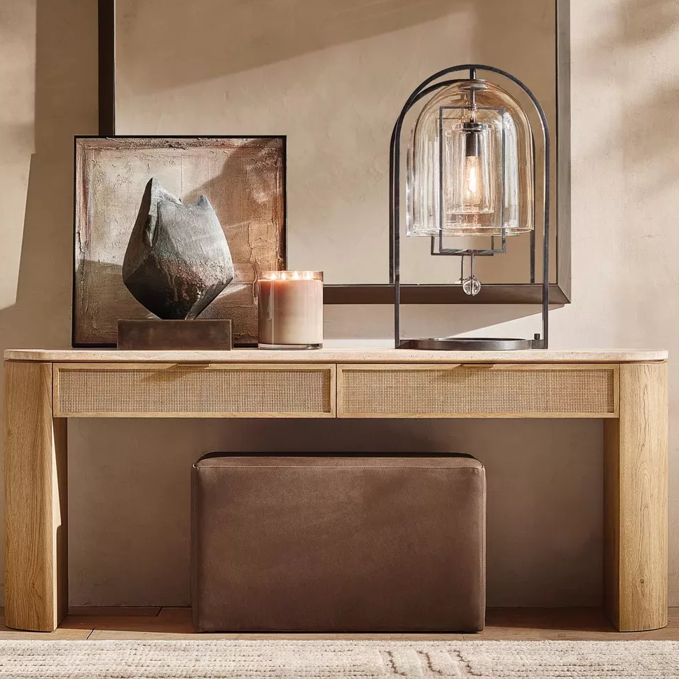 Im Zusammenhang mit der modernen Wohnkultur, die ein Gleichgewicht zwischen Natur und Praktikabilität verfolgt, ist dieser Konsolentisch , der Travertin, Massivholz und Rattan kombiniert, eine Kombination aus natürlichen Materialien und räumlichen Weisheit. Von der zugrunde liegenden Designlogik bis zur Anpassung an mehrere Szenarien wird der Wert durch Dimension zerlegt: