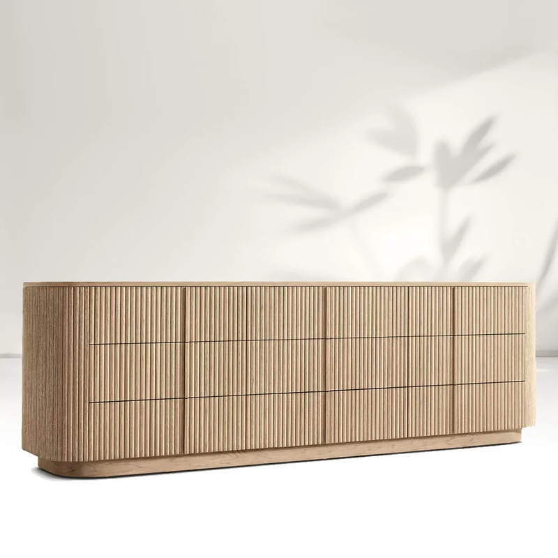 Abgerundeter Basisgefühl: Die feste Holzbasis hat eine fast mütterliche Weichheit. Die abgerundeten Kanten, die von Hand geschliffen wurden, bis sie sich wie ein glattes Kieselstock zur Verfügung stellen, heben Sie den Schrank gerade genug an, um das Tageslicht darunter überfliegen zu lassen. Diese 3 -cm -Lücke ist nicht nur funktional, sondern ein Designatem, wodurch sich das Stück nicht übermäßig am Boden verankert fühlt.